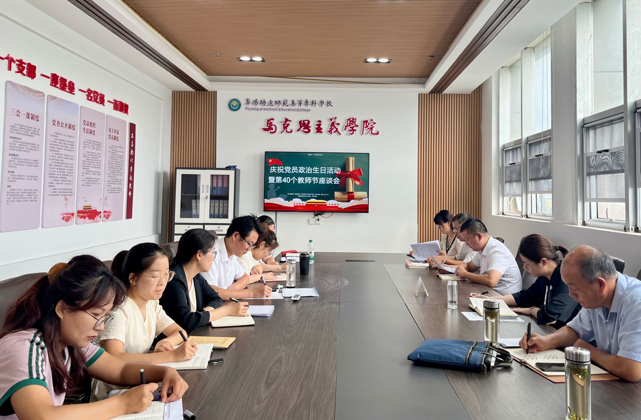 为弘扬教育家精神,激发广大教职工干事创业的热情,马克思主义学院开展党员政治生日活动暨第40个教师节座谈会,学院全体教职工参加会议。校党委副书记于华献来到马克思主义学院,代表校党委慰问全体思政课教师,会议由阜阳市社科联主席、马院直属党支部书记、院长何丽娜主持。
