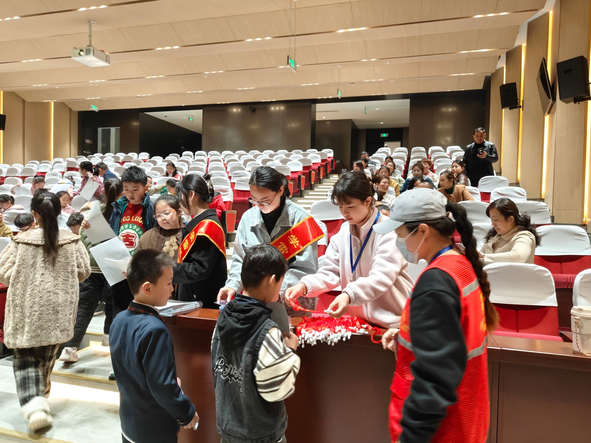 在“阜博红”小小志愿者见面会的活动上,他们协助工作人员分发材料、维护现场秩序,展现了大学生的团结合作精神和奉献精神。