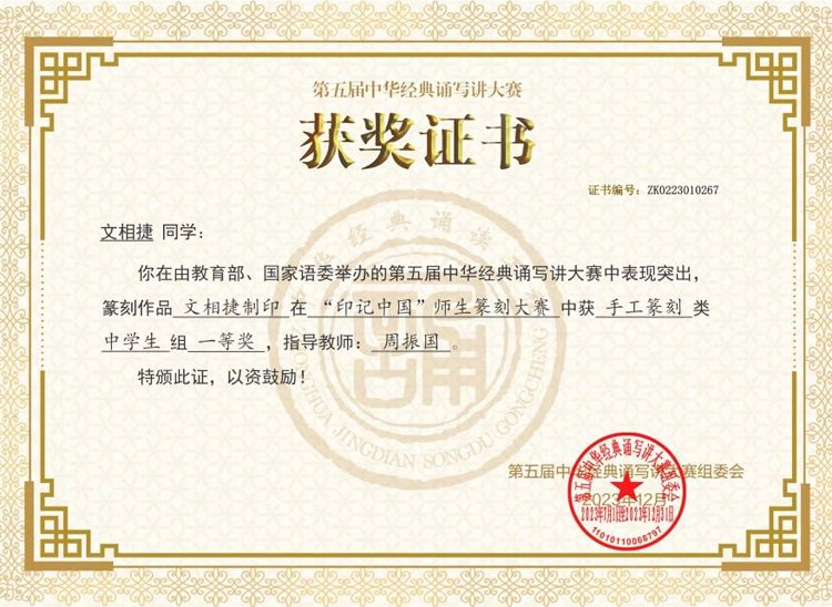近日,教育部、国家语委公布了《关于公布第五届中华经典诵写讲大赛获奖名单的通知》,我校推荐的学生作品在“印记中国”师生篆刻大赛中荣获一等奖。