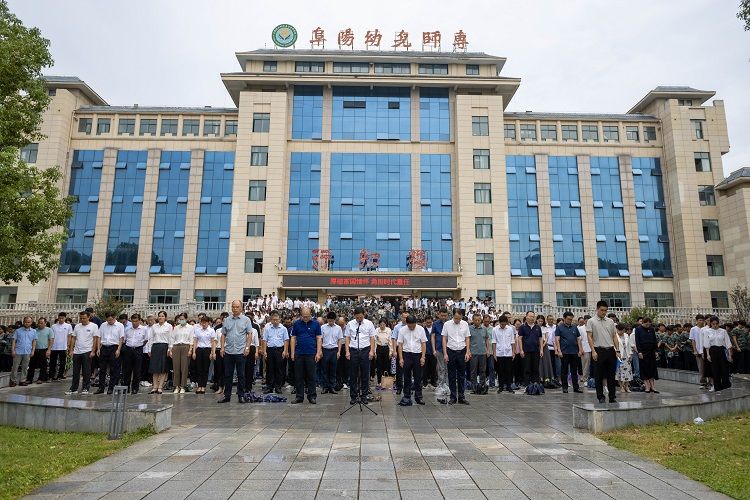 在低沉的防空警报声中,全体师生为“九一八”事变中遇难同胞默哀。