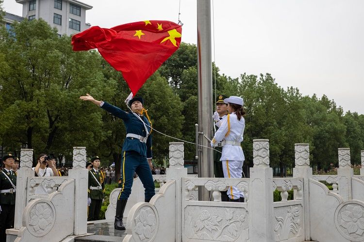 9时14分,升旗仪式准时开始,国旗护卫队队员身姿笔挺护送五星红旗入场,现场气氛庄严、肃穆。伴随着激昂的旋律,国旗缓缓升起,全体师生行注目礼,齐唱国歌。