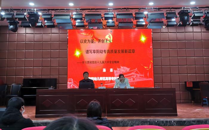 为深入学习贯彻党的十九届六中全会精神,进一步推动我校党史学习教育走深走实,1月6日下午,校长汤志在学术报告厅作题为“以史为鉴,开创未来,谱写阜阳幼专高质量发展新篇章”的十九届六中全会精神主题宣讲,为小学教育学院师生带来了一堂别开生面的形势与政策课。本次宣讲由小学教育学院党总支书记、院长郭玉敏主持,学院教师、学生代表聆听宣讲。