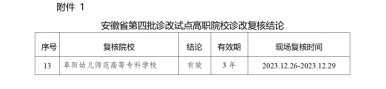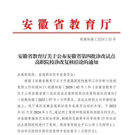 近日,省教育厅发布《安徽省教育厅关于公布安徽省第四批诊改试点高职院校诊改复核结论的通知》(皖教秘高〔2024〕33 号),对全省第四批职业院校诊改复核结果予以公布。学校顺利通过了安徽省职业院校教学工作诊断与改进专家委员会的严格复核,复核结论“有效”,在“专业层面螺旋建立与运行”“学生层面螺旋建立与运行”“引擎驱动与成效”“平台建设推进情况”等四个关键维度上获得了“显效”的优异评价。