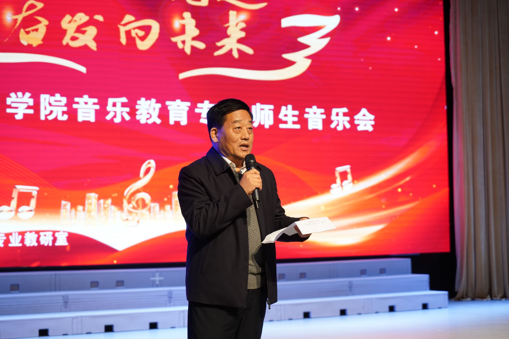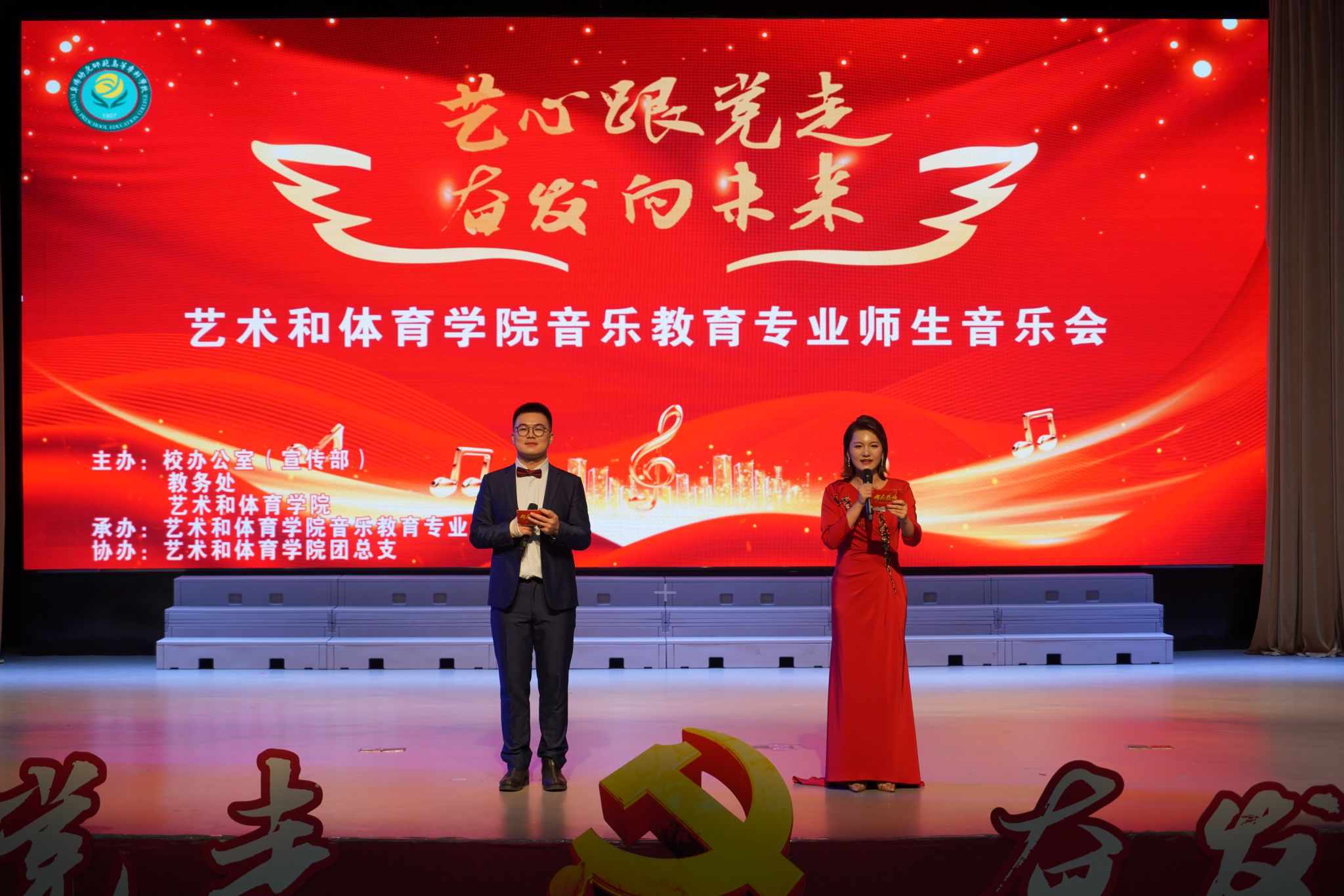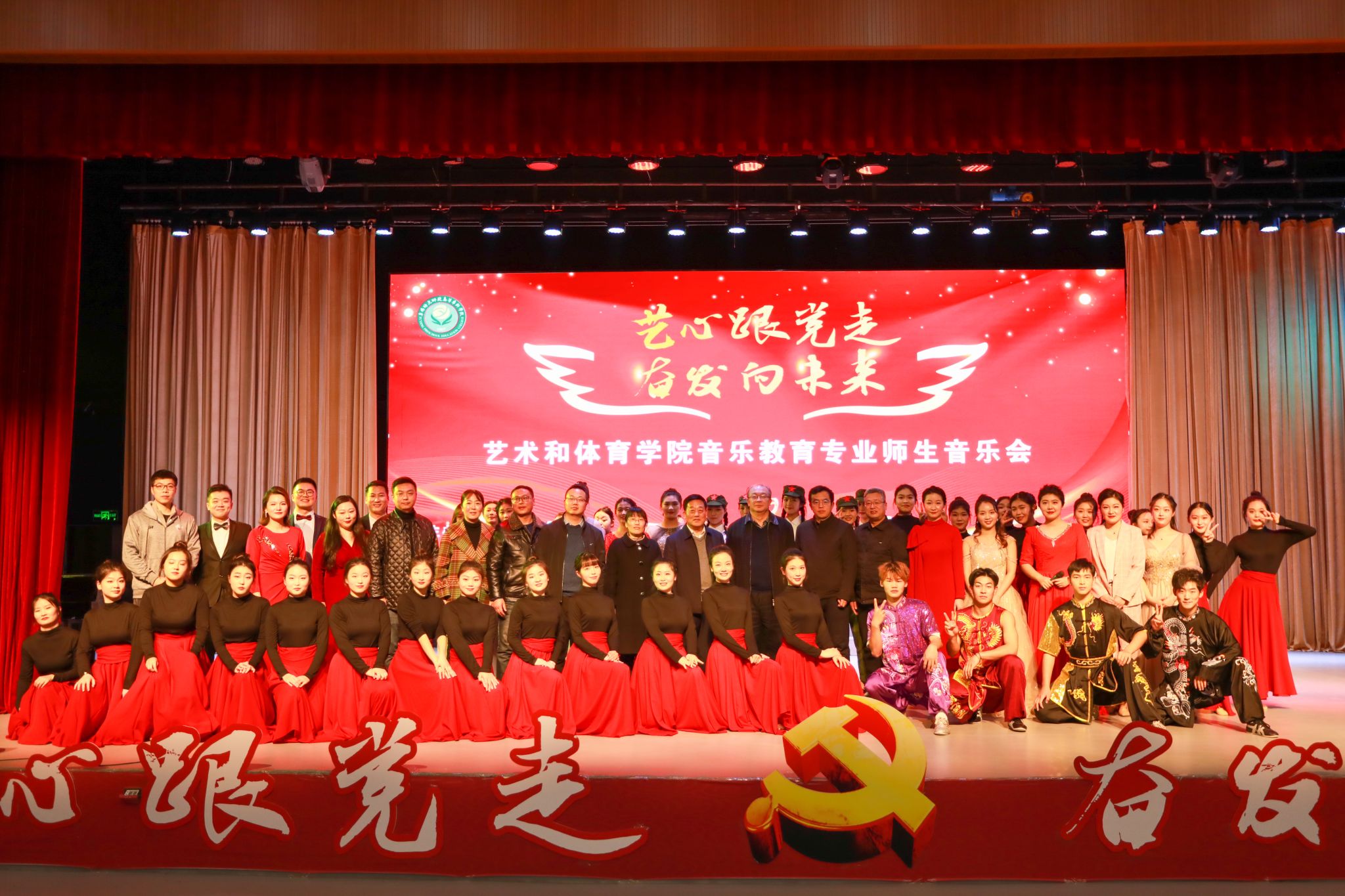 11月23日下午,艺术和体育学院音乐教育教研室在德馨楼演播大厅举办“艺心向党  奋发向未来”师生音乐会,校党委委员、纪委书记孙驰、副校长陈绪龙和各学院相关负责人莅临现场,孙驰为音乐会致辞,音乐会由张希、杨宝文主持。